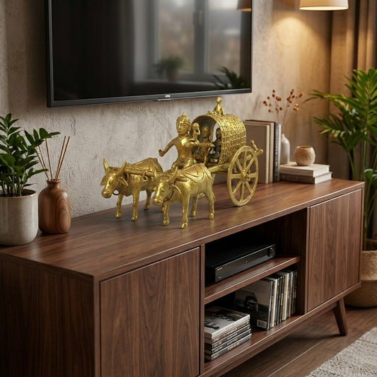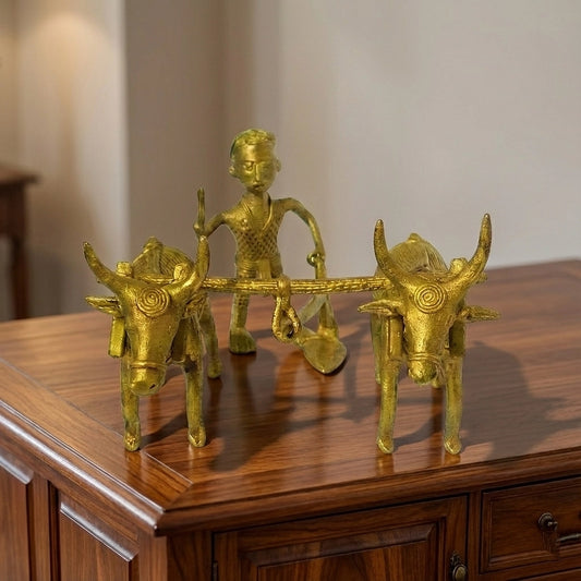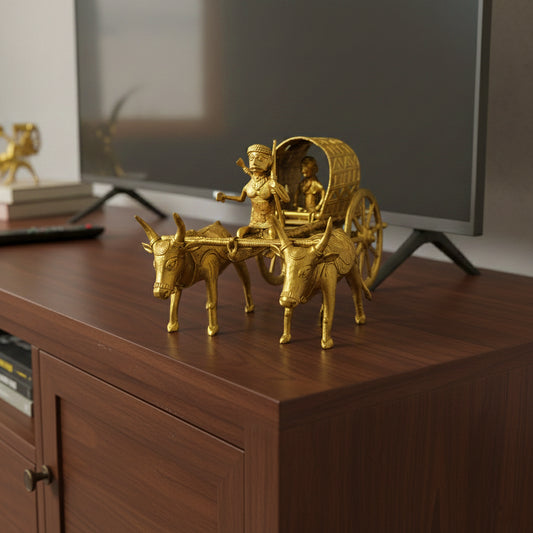 Golden Dhokra Bullock Cart Figurine | Tribal Man on Village Ox Cart – Handmade Brass Dhokra Art