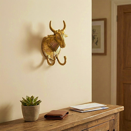 Golden Dhokra Tribal Bull Head Key Holder | Handmade Bronze Wall Key Hanger