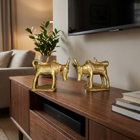 Golden Dhokra Double Bull Figurine | Handmade Bronze Twin Bull Sculpture