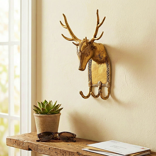 Golden Dhokra Deer Key Hanger | Handmade Bronze Deer Antler Wall Key Holder