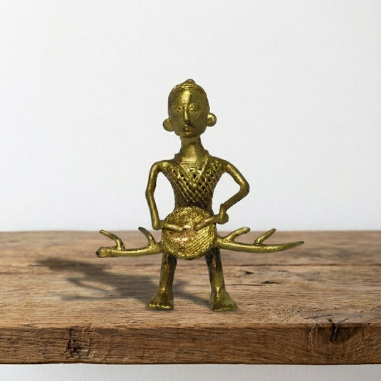 Golden Dhokra Tribal Drummer Man Figurine | Handmade Bronze Tribal Musician Sculpture