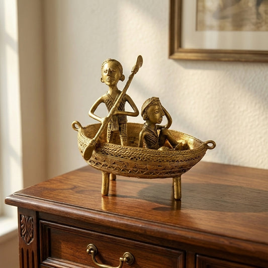 Boatmen Golden Dhokra Craft | Handmade Bronze Boat Sculpture in Dhokra Metal Art