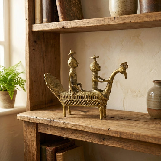 Golden Peacock with Men Dhokra Craft | Handmade Bronze Peacock Sculpture in Dhokra Metal Art