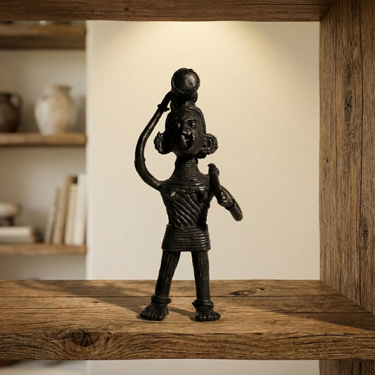 Black Dhokra Tribal Woman Carrying Axe and Wood – Handmade Bronze Dhokra Craft